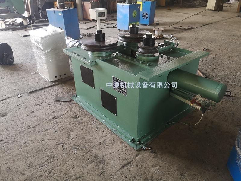 該機(jī)為叁輥型材卷圓機(jī),集機(jī)電一體。電機(jī)輸出的較高轉(zhuǎn)速通過傳動(dòng)裝置(聯(lián)軸器,減速機(jī),齒輪等)轉(zhuǎn)換成所需的大扭矩低轉(zhuǎn)速,帶動(dòng)固定位置的兩主動(dòng)輥實(shí)現(xiàn)旋轉(zhuǎn)運(yùn)動(dòng),為型材行走提供扭矩。被動(dòng)輥通過油缸前進(jìn)、后退實(shí)現(xiàn)位移,來(lái)控制直徑大小。三個(gè)工作輥成等腰三角形分布,通過調(diào)整移動(dòng)輥實(shí)現(xiàn)這三個(gè)點(diǎn)形成的弧線達(dá)到所需彎曲半徑,借助被動(dòng)輥的壓緊及兩主動(dòng)輥的旋轉(zhuǎn)運(yùn)動(dòng),使型材經(jīng)過多次連續(xù)彎曲,產(chǎn)生永久性塑性變形,用于常溫狀態(tài)下將型材卷制成圓形,弧形等工件。
