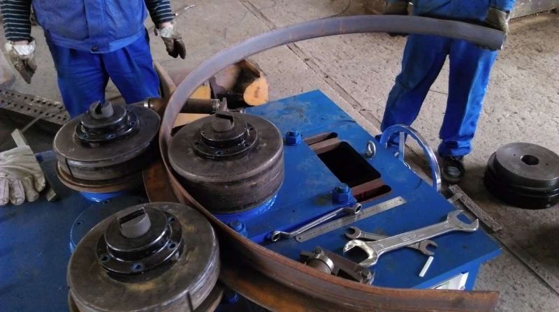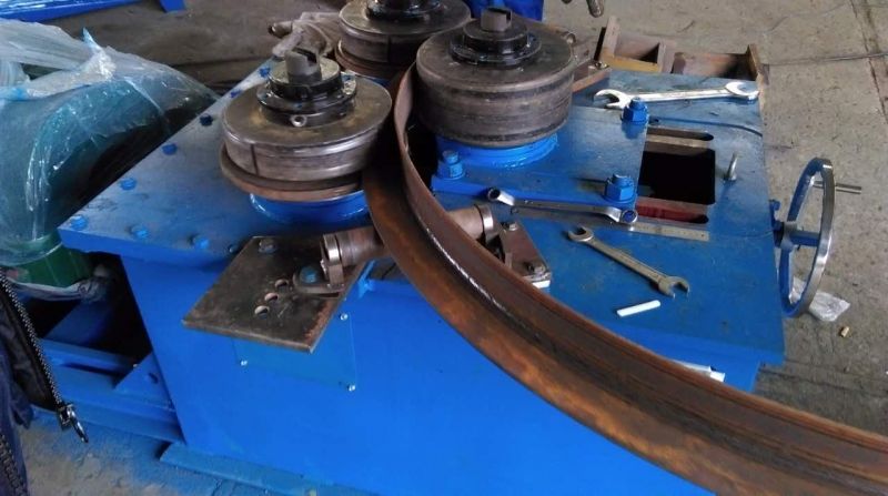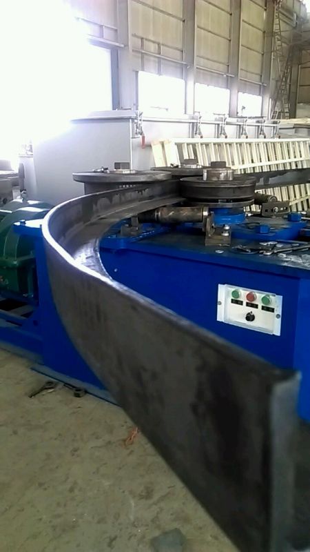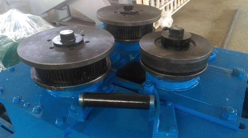 F6型卷圓機是對稱式三輥型材卷圓機,集機電一體,將電動機輸出的較高轉(zhuǎn)速通過傳動裝置、聯(lián)軸器、減速機、齒輪等轉(zhuǎn)換為所需的大轉(zhuǎn)矩低轉(zhuǎn)速,帶動位置固定的兩主動輥實現(xiàn)旋轉(zhuǎn)運動,為型材行走提供扭矩。被動輥通過手輪前進、后退實現(xiàn)位移,為卷制型材提供所需的加壓力,位移量由數(shù)字標尺實時顯示。三個工作輥成等腰三角形分布,通過移動被動輥位置實現(xiàn)這三個點形成的弧線達到所需彎曲半徑,即調(diào)整所彎型材的曲率。借助被動輥的壓緊及兩主動輥的旋轉(zhuǎn)運動,使型材經(jīng)過多道次連續(xù)彎曲,產(chǎn)生永久性的塑性變形,用于常溫狀態(tài)下將型材卷制成圓形、弧形、螺旋形等工件。372378308934599585